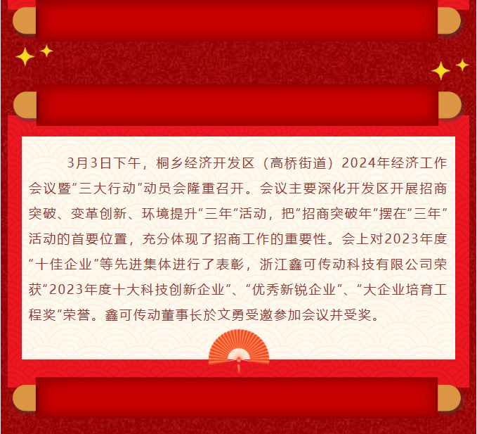 開年即開跑丨2024年經濟工作會議暨“三大行動”動員會上鑫可獲多項榮譽表彰! 2024-03-08 19:23:52 浙江鑫可傳動科技有限公司 瀏覽次數 1691 上一條致敬勞動者 奮進新征程 | 開發區(高橋街道)領導率隊開展“五一”節前走訪慰問活動 下一條各美其美·十二樂章丨活力高橋:扛起主平臺擔當,勇當桐鄉招大引強排頭兵